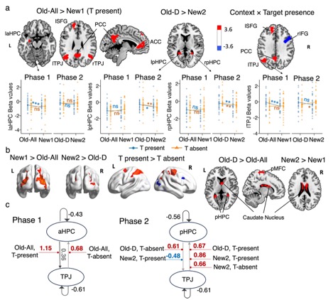 We also found that the hippocampus interacted with the temporoparietal junction (TPJ), in different ways depending on whether the context predicted the target or not. In Phase 1, activity in the anterior hippocampal regions (aHPC) increased activity in the TPJ when the target appeared in familiar displays. This pattern suggests that learned links between the visual context and the target location helped guide attention toward the target. When the target was missing, however, the direction of influence reversed: the TPJ influenced the aHPC instead. This likely reflects the brain updating its expectations when a predicted target did not appear. No reliable effects were observed for novel displays in this phase. In Phase 2, activity in the posterior hippocampal regions (pHPC) increased activity in the TPJ, but only when the target was absent in familiar distractor displays. If the pHPC stores information about relationships among distractors, this influence may help attention by signaling that locations typically occupied by distractors can be safely ignored.