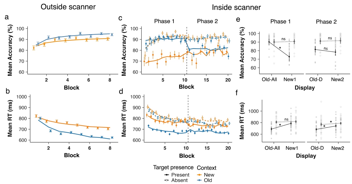 Figure 1. Behavioral results from the training session (outside the scanner) and the test session (inside the scanner). Panel (a) and (b) show mean accuracy and RTs, respectively, during the training session (1 block = 4 repetitions, 32 trials), and panels (c) and (d) depict accuracy and RTs during the test session. Data are plotted as a function of block, separately for Old and New distractor contexts and for target-present and -absent conditions during the test session. Panels (e) and (f) depict the accuracy and RT data, respectively, averaged per phase. Old contexts are labelled Old-All and the new contexts New1 in Phase 1 with fixed target locations (Block 1-10); and old contexts are labelled Old-D and new contexts New2 in Phase 2 with randomized target locations (Block 11-20). * denotes p < .01 and n.s. non-significant.