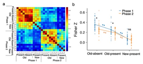 Figure 2. a Similarity matrices in the hippocampus area of correlation-based MVPA. b The mean z scores in different conditions based on the similarity matrices in a. * denotes p < .05, ** p < .01, and n.s. non-significant.
